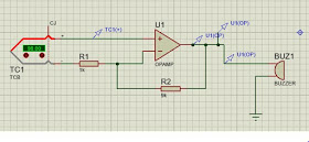 Suhu diukur oleh thermocouple, perbedaan jenis metal pada thermocouple menimbulkan adanya beda potensial pada ujung thermocouple. ujung negatif thermocouple dihubungkan ke pin negatif op-amp, ujung positif thermocouple dihubungkan dengan pin positif op-amp.